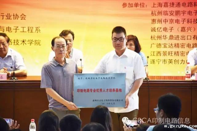 张瑾秘书长、姚纪欢院长共同授予惠州中京电子科技有限公司“人才培养与就业基地”。景占伟副总代表惠州中京授予电子电路技术学院“印制电路专业优秀人才培养基地”。