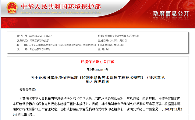 为贯彻《中华人民共和国环境保护法》和《中华人民共和国水污染防治法》,防治污染、改善环境,中国环境保护部决定制定国家环境保护标准《印制电路板废水治理工程技术规范》。目前,标准编制单位已编制完成标准的征求意见稿。根据国家环境保护标准制修订工作管理规定,现将该标准征求意见稿和有关材料置于网上进行广泛征询意见,并于2015年12月20日前将书面意见反馈至国家环保部。