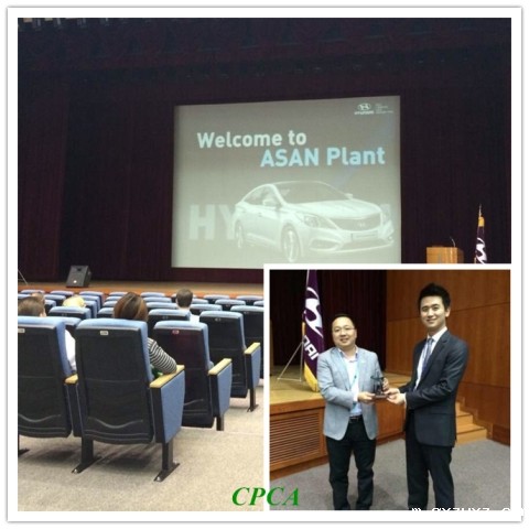 4月21日,CPCA赴韩考察团参观了韩国现代公司(HYUNDAI Motor,Asan),整个现代工厂全部机械化运作,不见几名工人,多了些金属的未来感。CPCA常务理事涂利伟代表CPCA赴韩考察团向现代公司赠送了礼物。当晚,CPCA副理事长兼秘书长王龙基、CPCA秘书长助理兼办公室主任洪芳、CPCA常务理事涂利伟先生参加WECC欢迎晚宴。