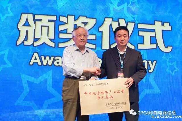 CPCA顾问何为为中国电子电路行业优秀服务园区得住四川遂宁PCB园区颁奖。