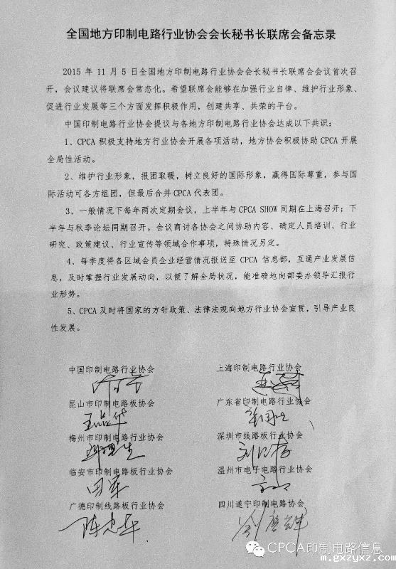 在2015年11月5日召开的首次全国地方印制电路行业协会会长秘书长联席会上,建议将联席会常态化。希望联席会能够在加强行业自律、维护行业形象、促进行业发展等三个方面发挥积极作用,创建共享、共荣的平台。