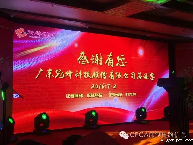 据不完全统计,目前印制电路上下游产业有近三十家企业登陆了新三板,其中线路板企业近20家。在经济新常态下,在集体唱衰制造业的环境下,冠锋电子能逆势而上,这是给我们印制电路制造业加油鼓劲,是对电子信息制造业的坚持和认可,这让我们欣喜。