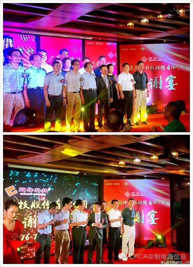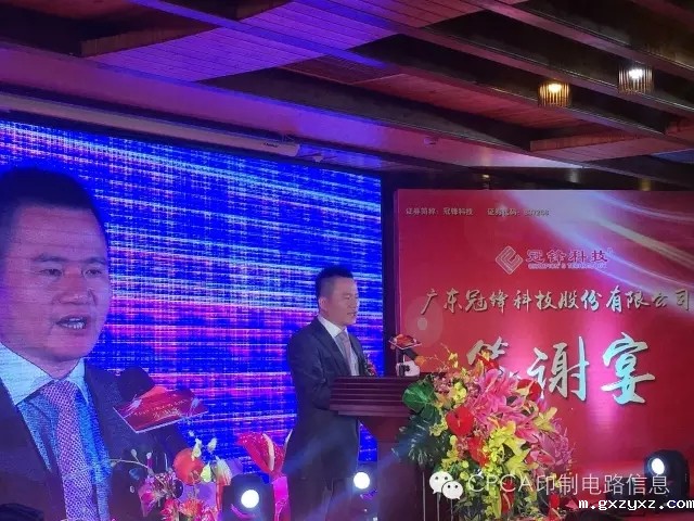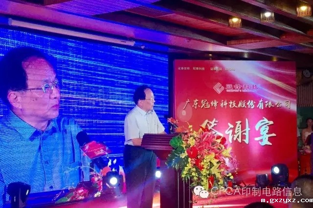 CPCA名誉秘书长王龙基在致词中讲到"人杰地灵的梅州,山青青、水秀秀、天蓝蓝,梅江河畔的风景如画。当前,在经济下行压力不断加大的情况下, 今年五月初,冠锋公司获准在“新三板”挂牌,成为梅州市印制电路板行业第一家、梅江区第三家在“新三板”挂牌的企业,纯属不易。这是冠峰公司和林能文董事长的喜庆,这是梅州印制电路行业协会的喜庆,这也是中国印制电路行业协会CPCA,即将更名为必威beywayCPCA的喜庆!企业需要努力!中国电子电路行业的同仁们必须齐心继续奋斗!把我们伟大祖国的电子电路行业推向世界强盛!"冠锋公司的上市,告诉我们:无论企业规模大小、无论企业创业长短、无论生产什么产品,只要我们不懈坚持,就一定可以成为知名的、强盛的民族企业!