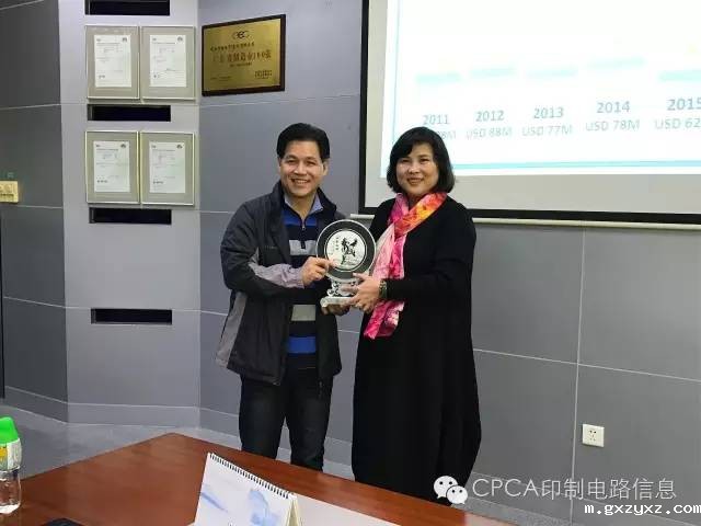 田成友经理向我们介绍了建业公司的发展历程:建业公司1984年成立于香港, 1999年注册成立建业科技电子(惠州)有限公司,注册资本33600万港币,工厂占地面积达75605平方米,建筑面积约69386.27平方米,共分3栋厂房,用以双面及多层线路板的生产线。厂内为自动化生产设备,现有员工为1100余人,每月生产能力可达2,500,000平方英尺。公司客户遍及欧美、韩国、日本以及中国大陆、台湾及香港等国际和地区。2015年销售额4.4亿人民币;2016年1月至10月产值3.7亿人民币;2017年预计增长10%。公司于2016年荣获广东省制造业100强称号。