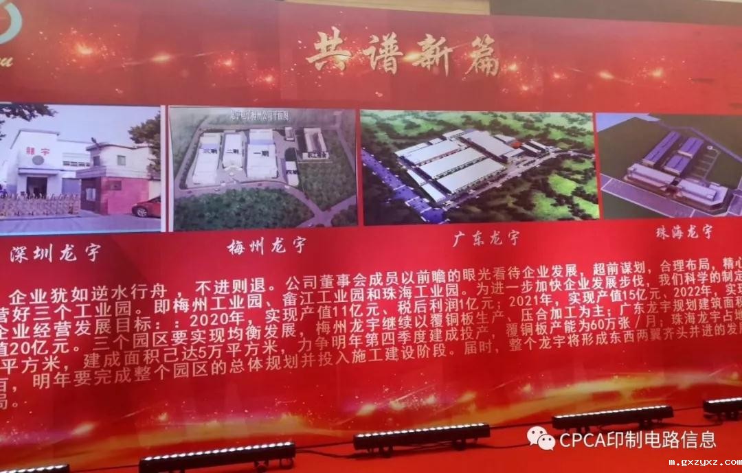龙宇电子创建于1999年,投资一二百万元,从生产盖垫板开始,不断转型升级、扩大,现在已经发展成具有PCB、压合和CCL三个事业部,在梅州两个工业园中拥有八十亩和一百四十亩地的二个工厂(科捷、梅州奔创),在深圳拥有二个工厂、在珠海还有一个刚签的占地一百二十亩的新厂。2018年销售额达七个亿,今年预计完成将超过九个亿,明年准备超过11亿,2021年要超过十五个亿!今年纳税超三千多万,利润可达八千万。为国家提供了一千多个就业岗位的国家大型民族企业。是一个朝气勃蓬勃的、欣欣向荣的、连续多年的百强企业和优秀民族企业、是梅州协会的副会长单位。
