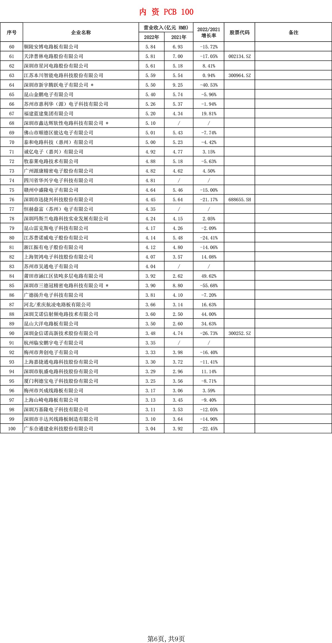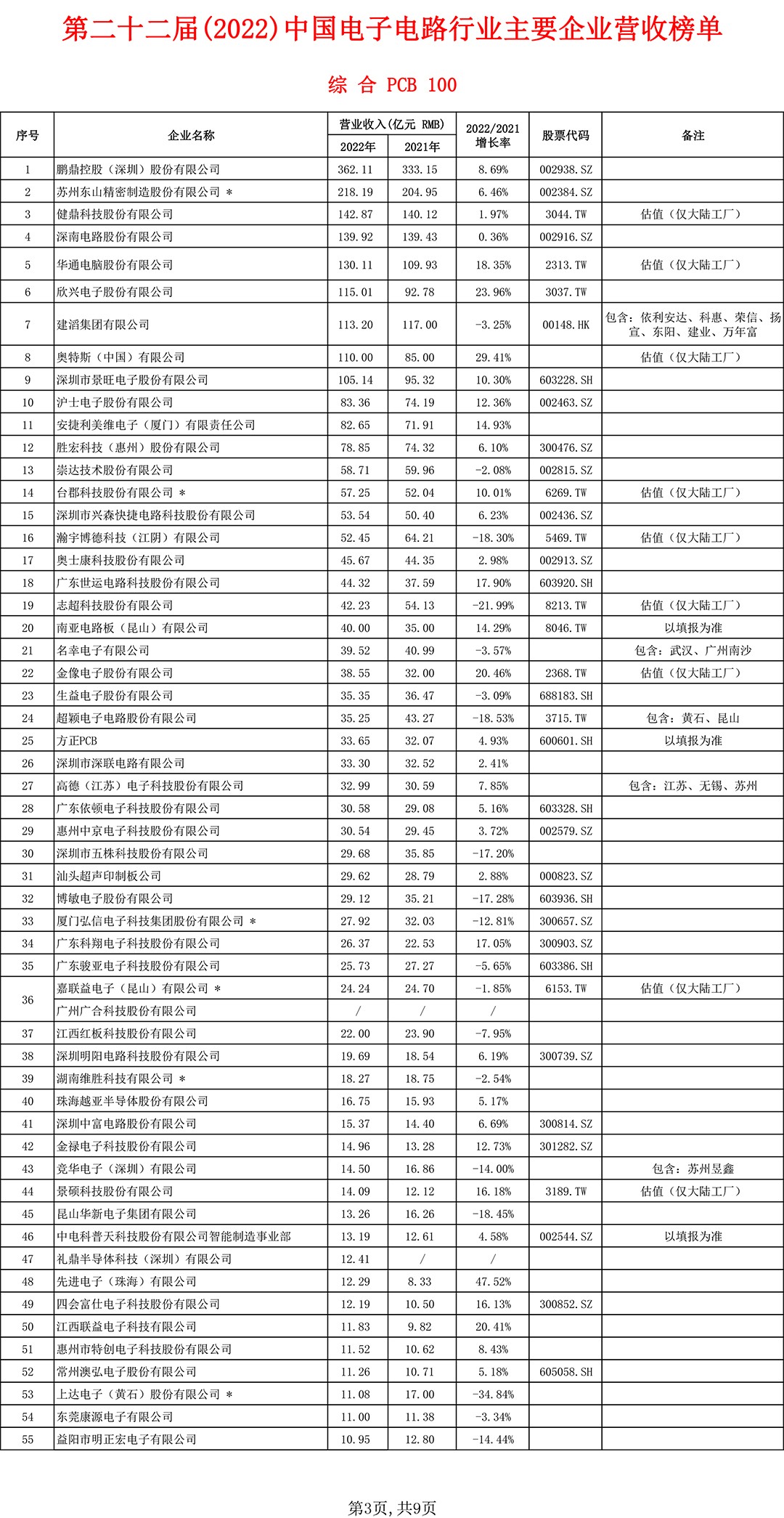 第二十二届(2022)中国电子电路行业主要企业营收榜单